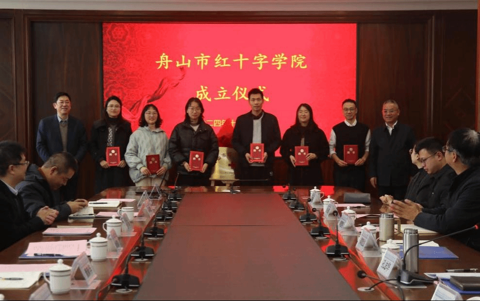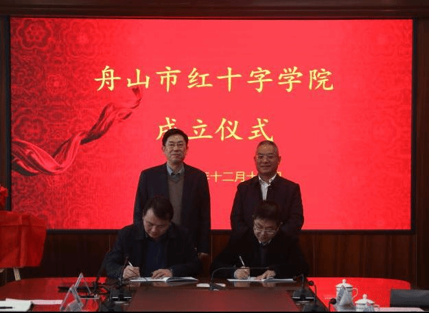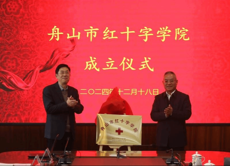 2024年12月18日下午,舟山市红十字学院在我校隆重成立。市红十字会党组书记、常务副会长徐俊军和我校校长郑能波共同为“舟山市红十字学院”揭牌并讲话,市红十字会副会长许平和我校副校长孔志华共同签署《“红十字学院”联合共建合作协议书》。市红十字会现场应急救护培训指导中心主任蒋朝进,普朱管委会红十字会秘书长董新华和我校相关部门和健康学院负责人、教师学生代表参加仪式。