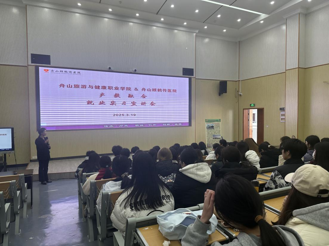 3月19日下午,为深化产教融合、促进护理专业学生高质量就业,舟山顾鹤传骨伤医院校企合作专题宣讲会在舟山旅游与健康职业学院明德楼307教室成功举行。舟山顾鹤传骨伤医院党支部书记兼人事科主任陈燕主讲,健康学院2024级护理专业6班、7班全体学生参会,现场气氛热烈,互动频繁。