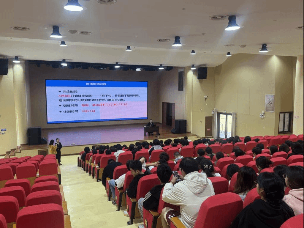 为激发学生参与体育锻炼的内驱力,推动《国家体质健康标准》的深入实施,我校于4月7日中午举办体质健康抽测动员大会。健康学院党总支副书记王珊珊、旅游学院党总支副书记郑婷璐,负责相关工作辅导员及240名学生齐聚一堂,共启提升体质、锤炼意志的新征程。