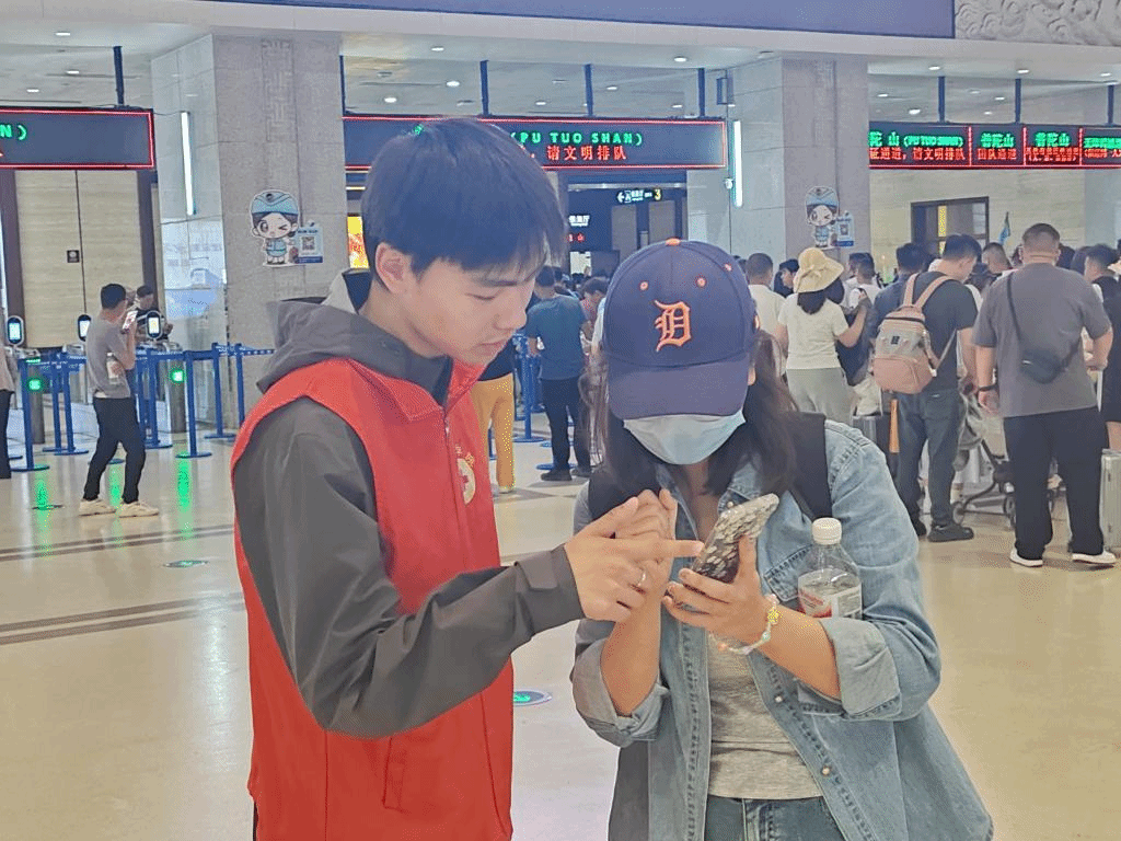 清晨普陀山购票处的电子屏滚动着“身份证通道,请文明排队”的提示语,红十字志愿者小正帮助戴渔夫帽的老人操作自助购票机。她左手托着老花镜,右手点击屏幕上的“现金支付”按钮,胸前的“舟山旅游与健康学院红十字志愿者”徽章在晨光中格外醒目。志愿者或俯身耐心指导游客操作手机,指尖轻点屏幕,为游客解决船票预约难题;志愿者们的服务细致入微。在公交站台,他们挺拔站立,微笑指引游客文明乘车;在志愿服务点,他们俯身倾听游客需求,手势轻柔而专业。一位杭州游客竖起大拇指:“志愿者小姑娘一直在微笑指引,帮我提行李时连手套都没来得及摘,服务太周到了!”