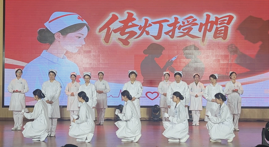晚会最庄重的环节当属授帽仪式。在红色背景屏上南丁格尔肖像的见证下,护理学子单膝跪地,由前辈为其佩戴象征职业精神的护士帽。这一仪式不仅是护理精神的薪火相传,更是两代人对使命的郑重承诺。正如主持词所言:“此帽非冠,乃心灯一盏;此礼非俗,乃使命在肩。”