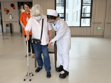 在辅助拐杖行走环节,同学们更是展现了扎实的技能基础。他们依据每位长者的身体状况,精准调节拐杖高度至最适宜位置,清晰、耐心地讲解并示范“三点式”、“两点式”行走方法的要领和安全要点。在协助练习过程中,同学们时刻保持警惕,一手稳固支撑,一手温柔引导,密切观察长者的反应与步伐稳定性,确保每一次练习都安全且有效。在同学们的悉心帮助下,长者们一步步尝试,脸上逐渐浮现出克服困难后的欣慰笑容。