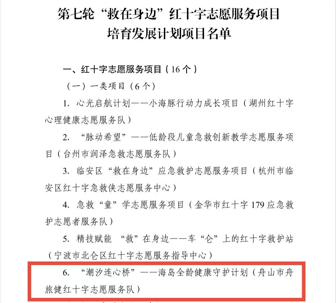 2025年6月16日,省红十字会印发通知,公布第七轮 “救在身边” 红十字志愿服务项目培育发展计划入选名单,共31个项目入选,其中红十字志愿服务项目16项(一类项目6个)、大学生社会实践项目15项。