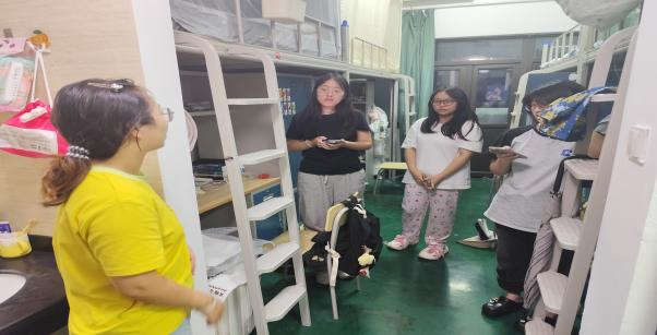 班会活动结束后,学院领导与教师深入学生宿舍,与学生亲切交流。老师们细致地询问大家返校后的生活适应情况及新学期学习规划,耐心解答疑问,并叮嘱学生注意用电安全、保持宿舍整洁,共同营造温馨、和谐、安全的居住环境。一句句暖心的问候,让初秋的校园充满温情。