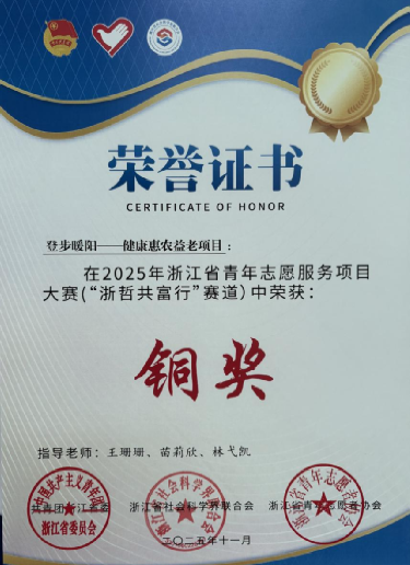 近日,由共青团浙江省委、浙江省社会科学界联合会等主办的2025年浙江省青年志愿服务项目大赛圆满落幕。由我校健康学院与普陀区社科联共同打造的“登步暖阳-健康惠农益老项目”在本次大赛“浙哲共富行”赛道中脱颖而出,荣获省级铜奖!这一荣誉是对健康学院长期以来扎根基层、服务社会、助力共同富裕实践探索的充分肯定。