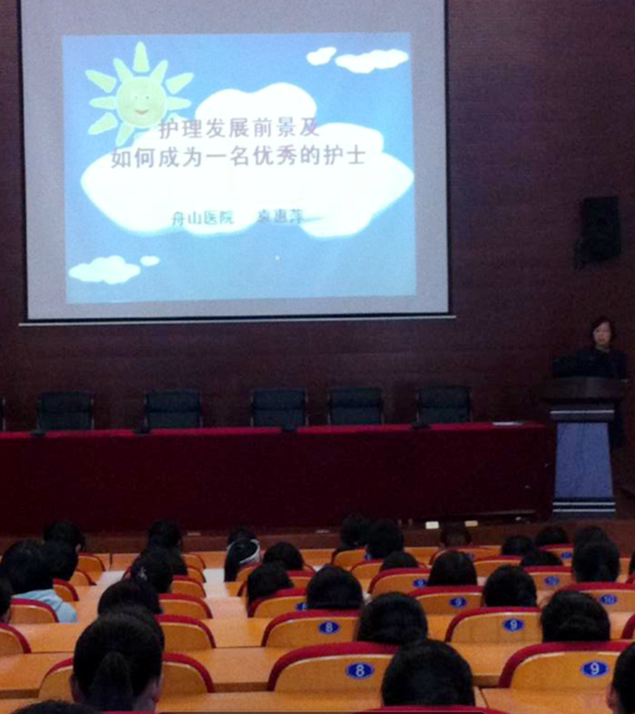 医院护理部主任袁惠萍老师作为了题为《护理发展前景及如何成为一名优秀的护士》讲座,详细介绍了护理的发展前景,浙江省护理专业就业需求,舟山医院护士需求和发展情况,还阐述了护士的工作职责、需具备的素质和如何成为一名优秀的优秀,并诚挚欢迎广大新生在未来进入医院实习或就业。会后,学生在各病区护士长的带领下参观了病区和门诊部,并向学生详细地护理工作的流程、内容和注意事项。