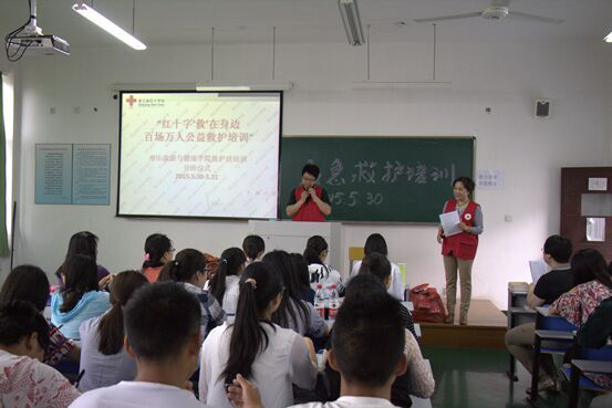 这次培训得到了市红十字会的大力支持,市红十字会刘文琴老师亲临指导,应急救护一级培训师俞晓明老师担任主教,健康分院竺静、裘晓华、刘苗生、王崇宇等老师承担教辅工作,来自健康分院、商务系、旅游分院的50名红十字会志愿者参加了此次培训。