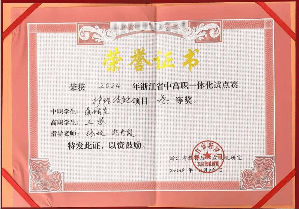 2024年11月25日至26日,浙江省中高职一体化试点赛“护理”项目在金华职业技术大学举行。我校健康学院王紫同学携手舟山职业技术学校虞婧宣同学,经过激烈角逐,荣膺三等奖的佳绩!